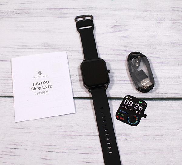 구성 매우 간단해요, 워치와 충전 줄과 간단한 사용설명서가 들어 있습니다.