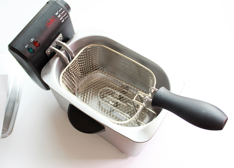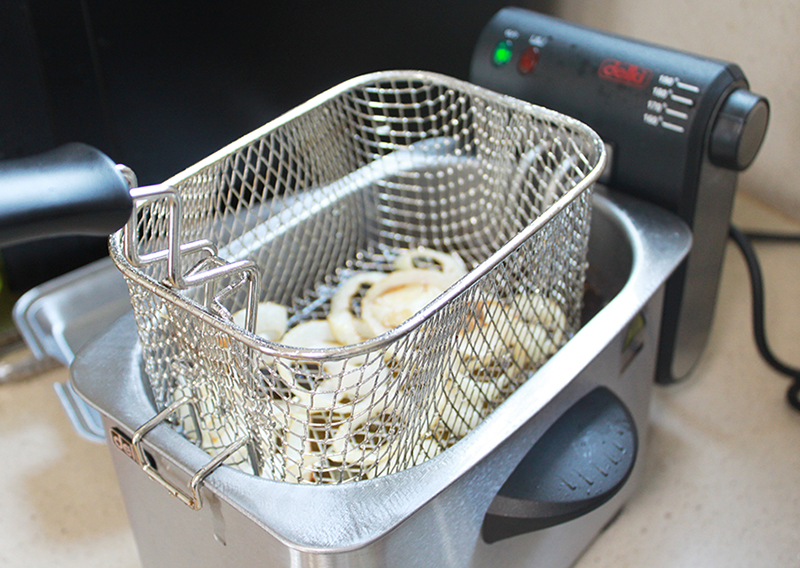 3. 빨간 불이 꺼지면 요리 재료를 튀김 바스켓 안에 넣고 유조통으로 넣어서 턱에 걸쳐줍니다.