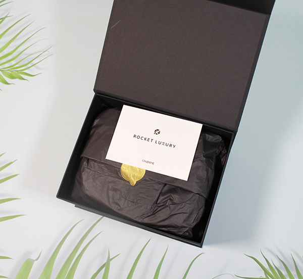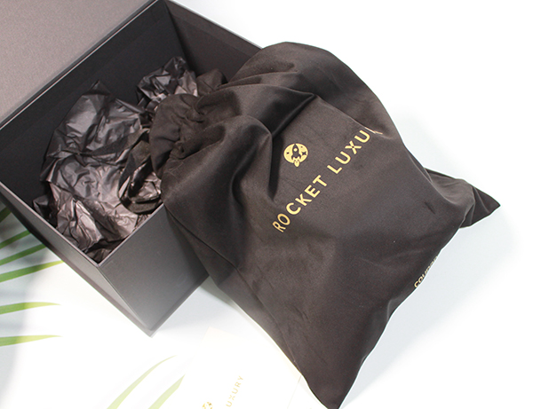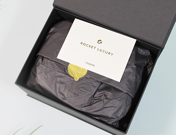 검은색의 종이 박스를 열어보면 그 안에 로켓력셔리 안내용지와 함께 검정색 습자지 같은것으로 또 포장되어 있습니다.