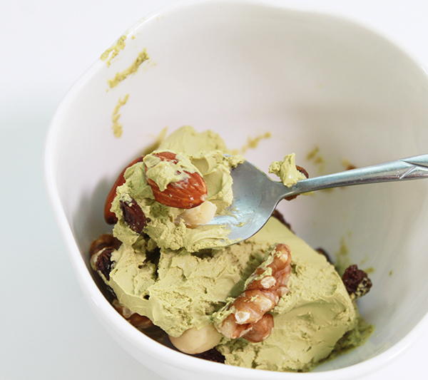 그래서 그다음에는 요즘 녹차 그릭요거트를 반 만 덜고, 집에 있던 하루 견과 한 봉지를 넣어서 비벼 먹었어요