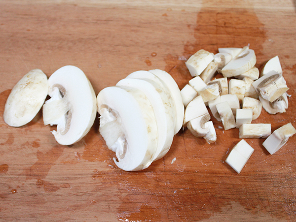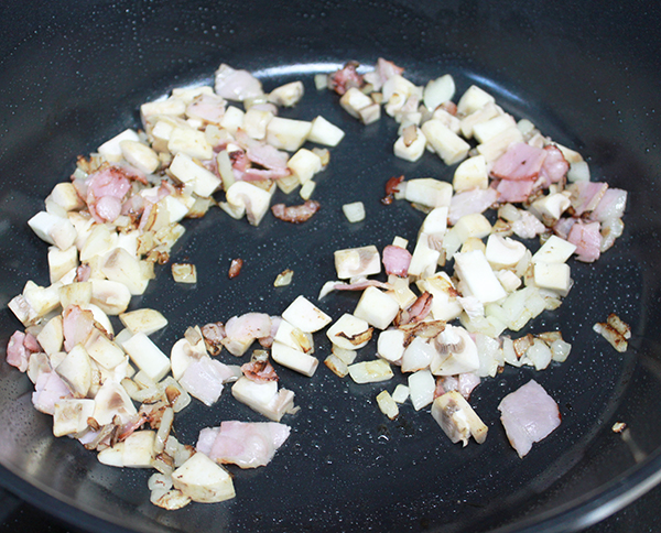 2. 양송이도 작게 썰어주고, 베이컨도 작게 썰어준 뒤 양파와 같이 볶아 줍니다.