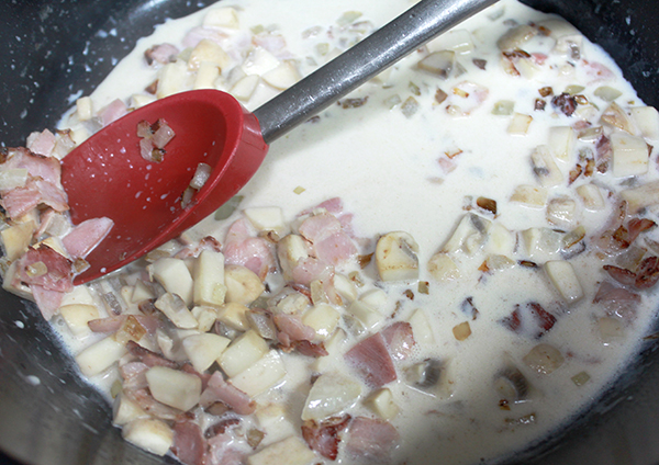 3. 재료가 어느 정도 익으면 우유를 부어서 끓여줍니다.