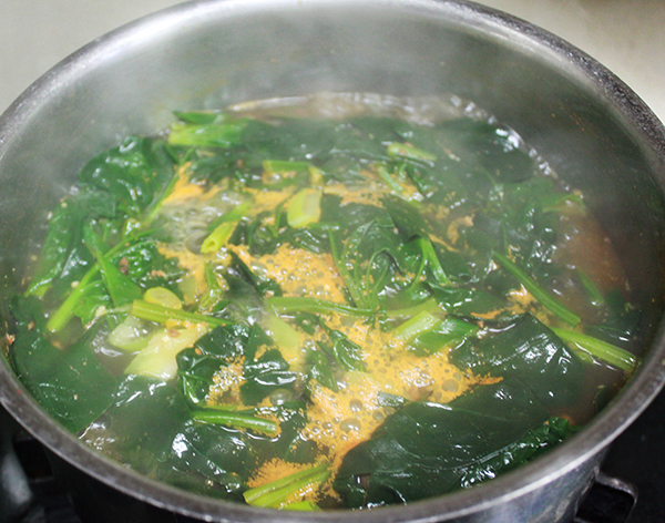 4. 국물이 끓으면 시금치를 넣고 고춧가루 한 스푼을 넣은 뒤 대파를 넣고 한소끔 끓인 뒤 소금으로 간을 맞춥니다.