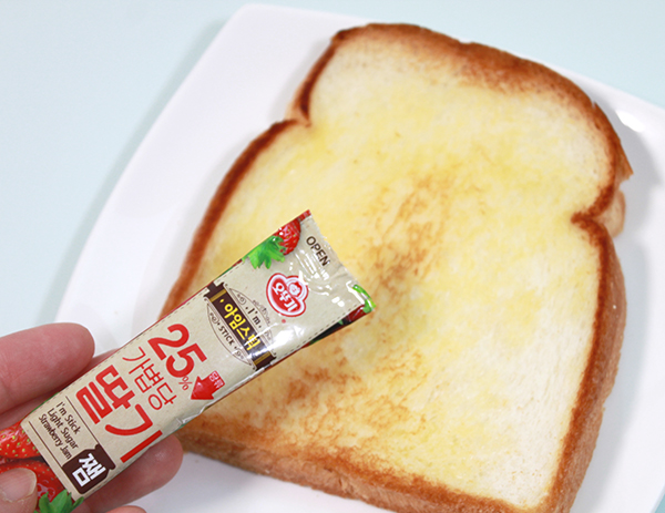 딸기잼 스틱 위 윗부분을 자르고 쭉 짜면 나오는데요, 보통 식빵 한쪽만 먹게 되면 반 정도만 짜 먹고 반은 남게 돼요.