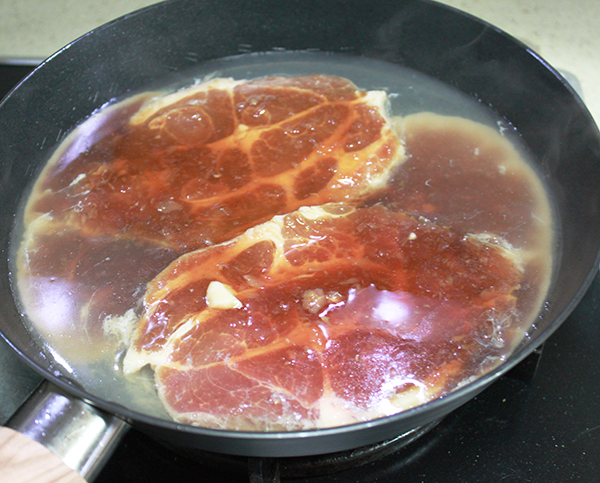 일단 프라이팬을 가열하고, 물을 조금 붓습니다. 그리고 물이 끓으면 고기를 넣어 익힙니다.