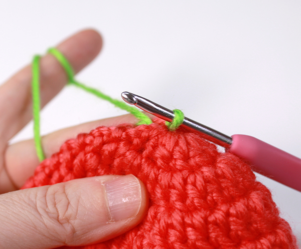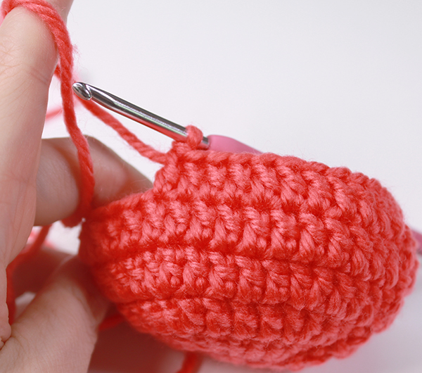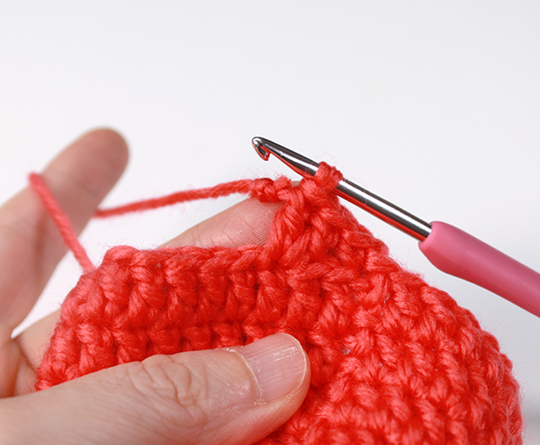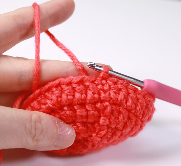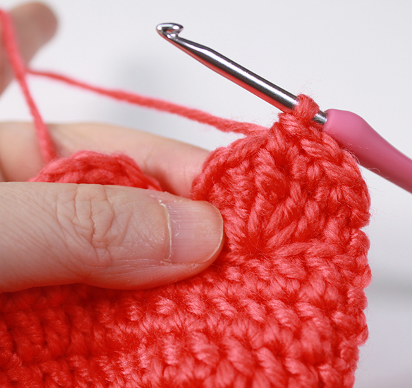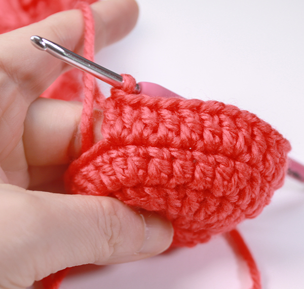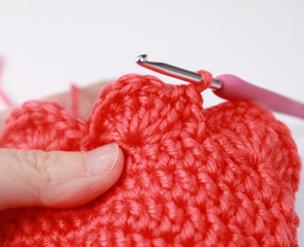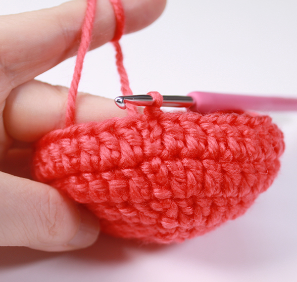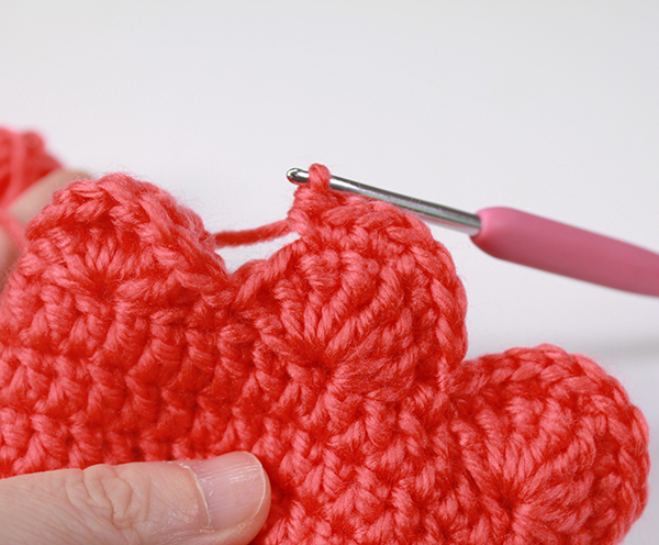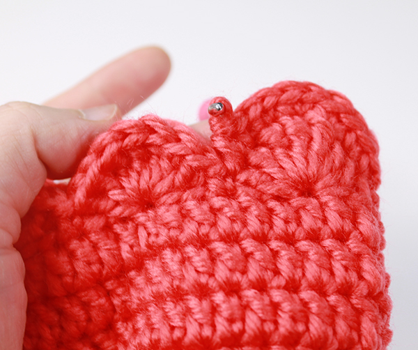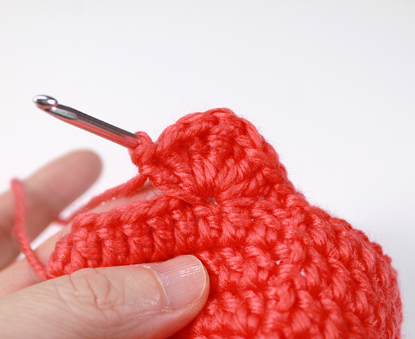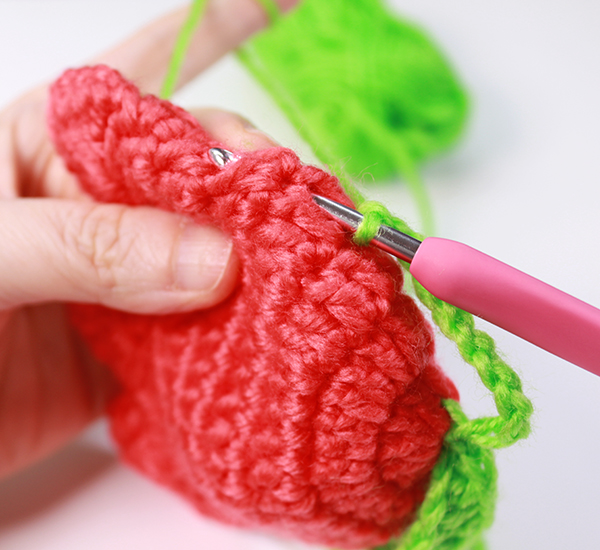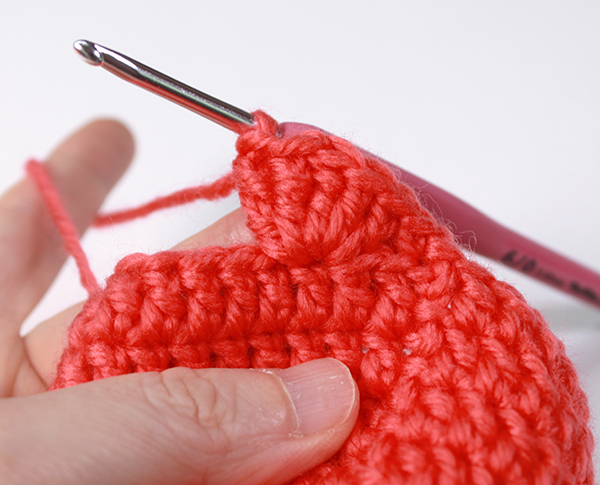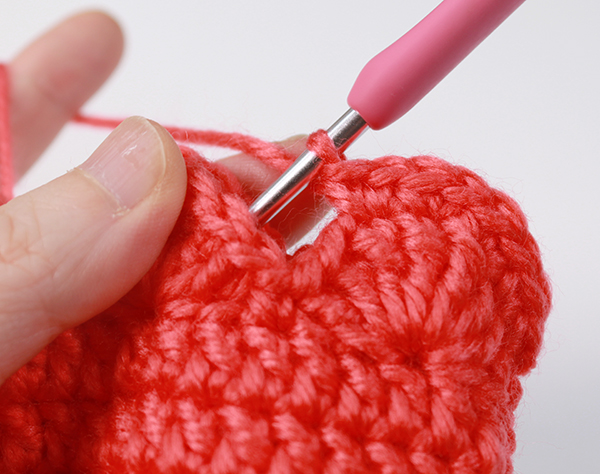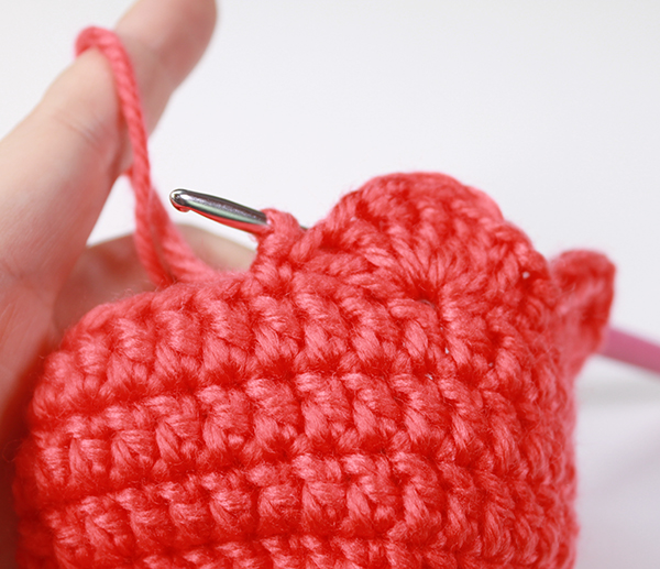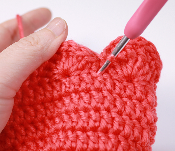 12. 8단에서 짧은뜨기 떴던 곳은 짧은 뜨기 코의 아래쪽으로 바늘을 넣어서 빼뜨기 해줍니다. (사진참조)