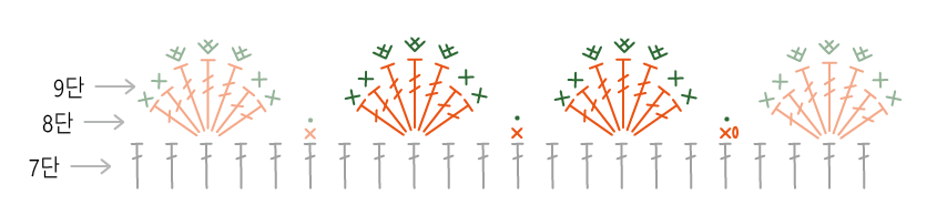11. 도안을 보시면 짧은뜨기 한코에 한 개씩 두 번, 그리고 두 길 긴뜨기 떴던 코에는 짧은 뜨기가 한코에 두 번씩 들어갑니다.