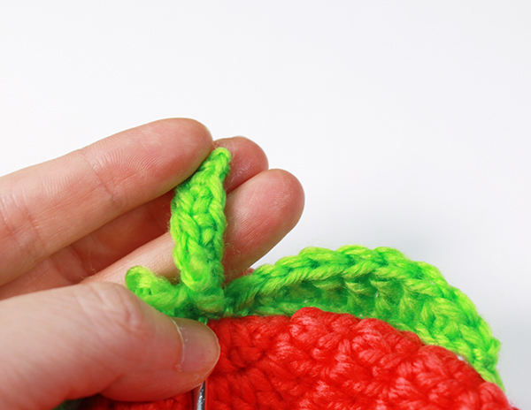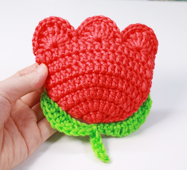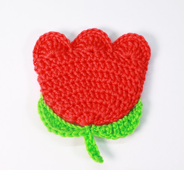 4. 튤립꽃의 양쪽 끝에 잎사귀를 만들어서 붙여줄 거예요, 한쪽 옆면을 보시고 튤립꽃의 4~5단 사이에 빼뜨기 해주세요