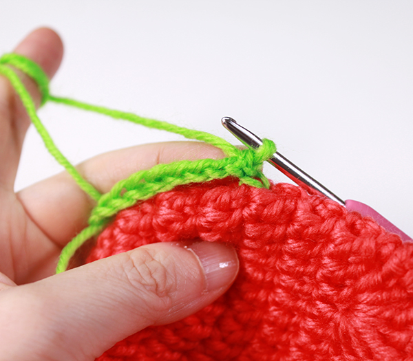 11. 사슬 하나를 더 해주고 5번째 사슬 뒷산을 잡고 짧은 뜨기를 코마다 해주면서 아래쪽으로 떠주세요