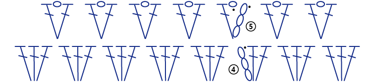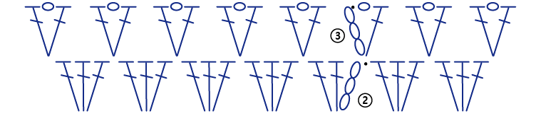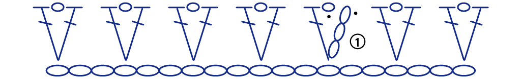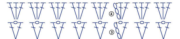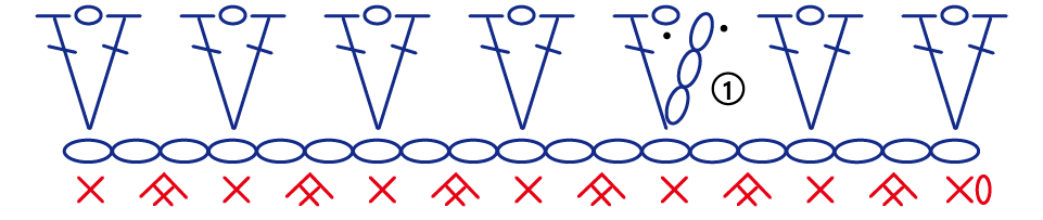 3. 아랫단의 브이자 모양 가운데 부분 고랑에 한길긴뜨기 세개씩 떠줍니다.