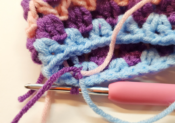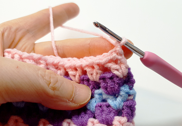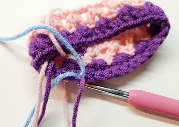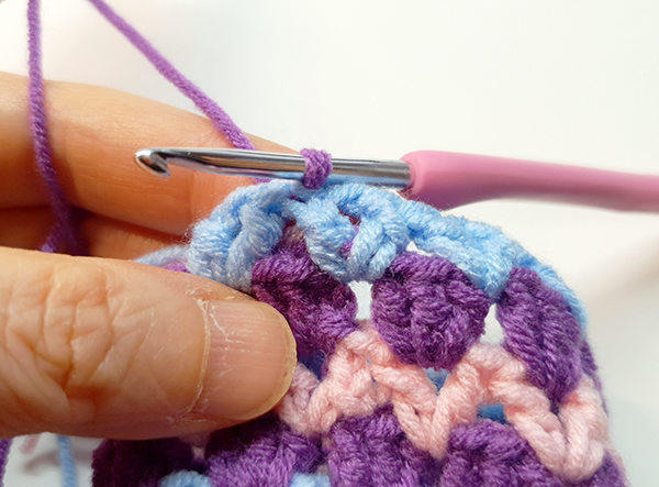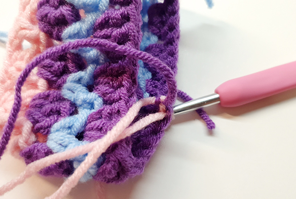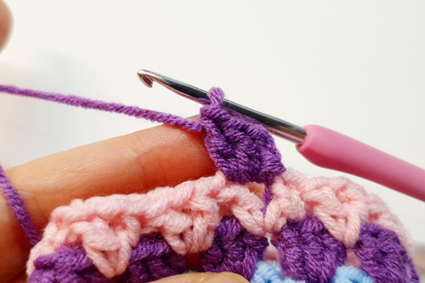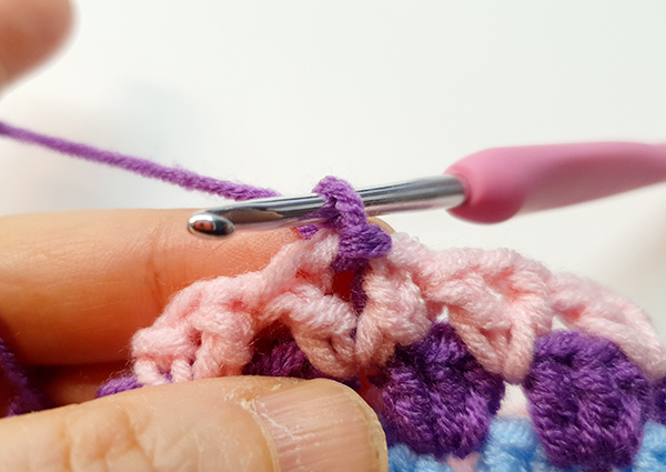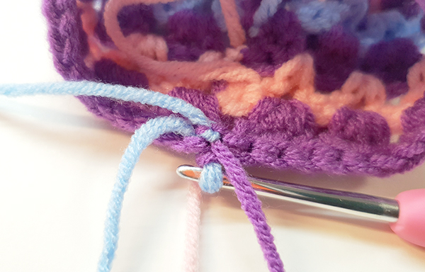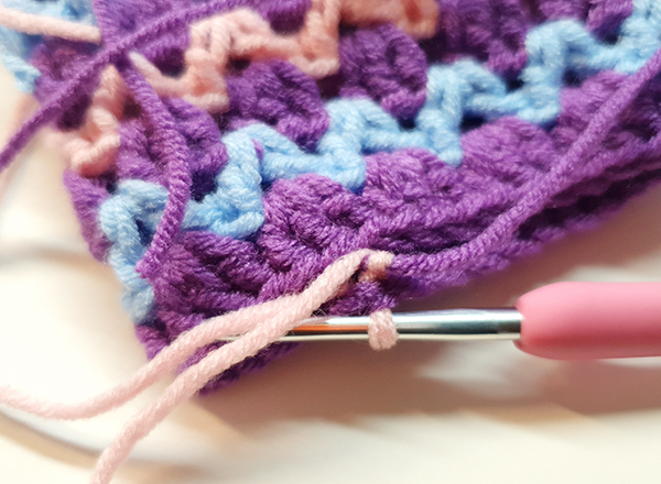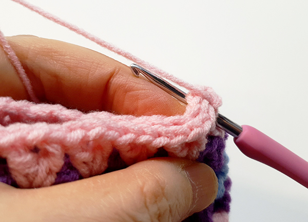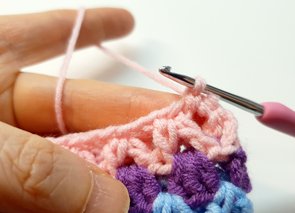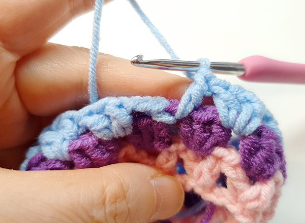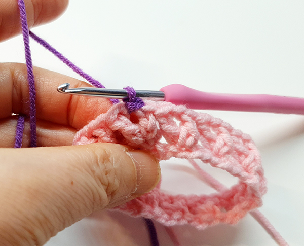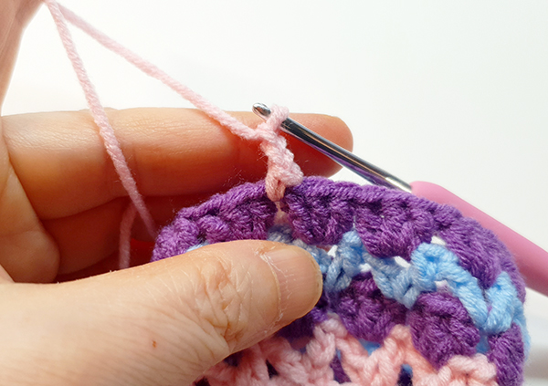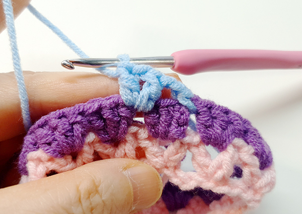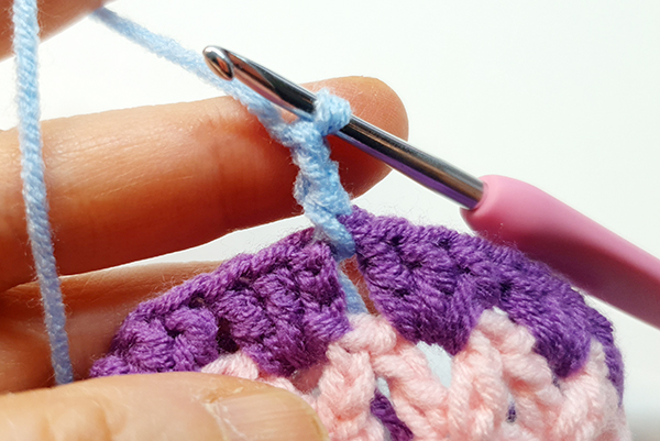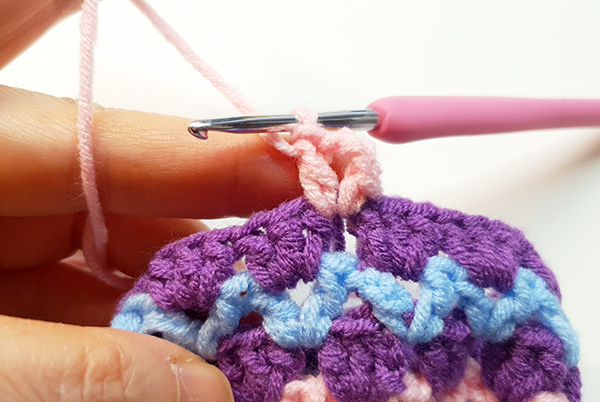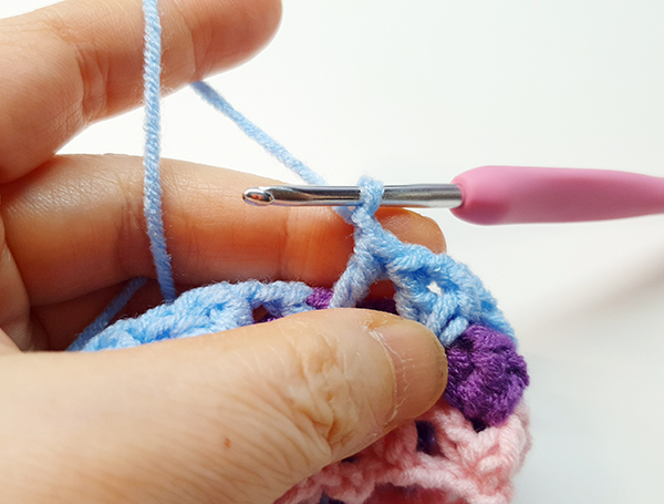 4. 기둥사슬 3번째 코에 빼뜨기 해줍니다. 이때 빼뜨기 할 자리에 바늘을 넣고 다른 칼라의 실을 가져와서 빼뜨기 해줍니다.