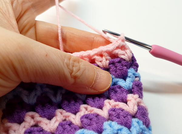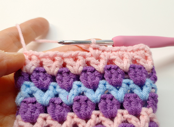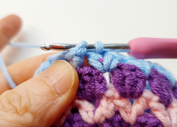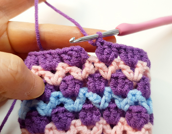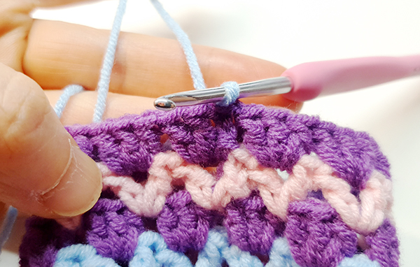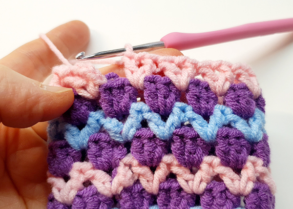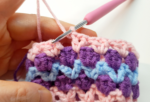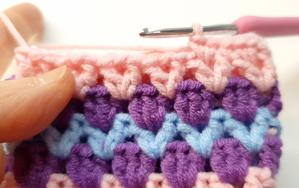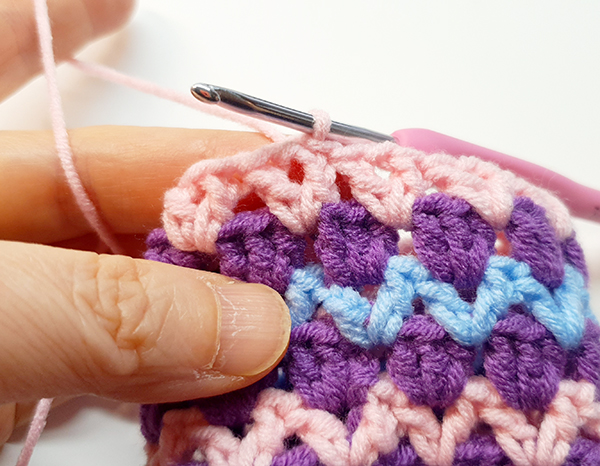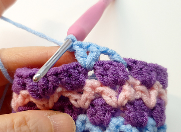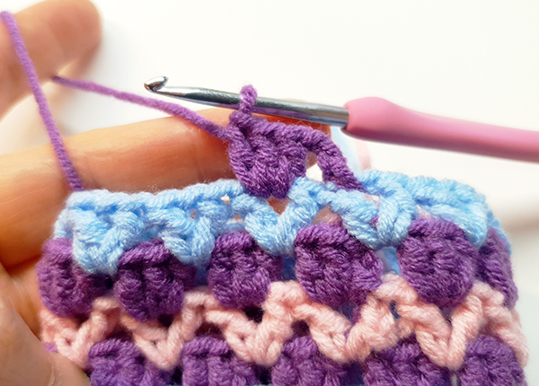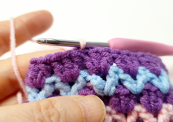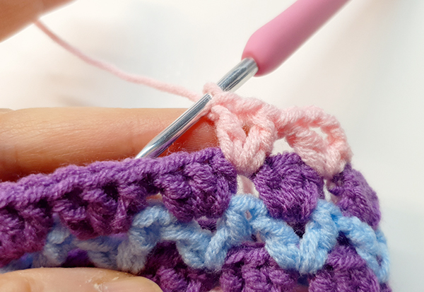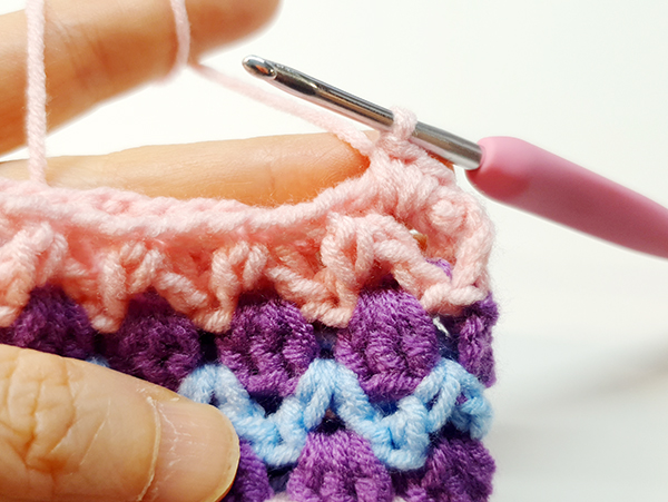 4. 브이자와 브이자 사이의 고랑에도 짧은 뜨기를 한개 앞 뒷면 같이 잡아서 떠줍니다.