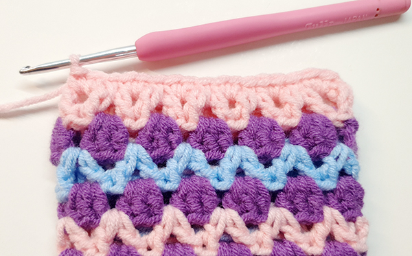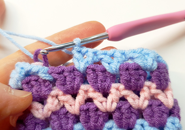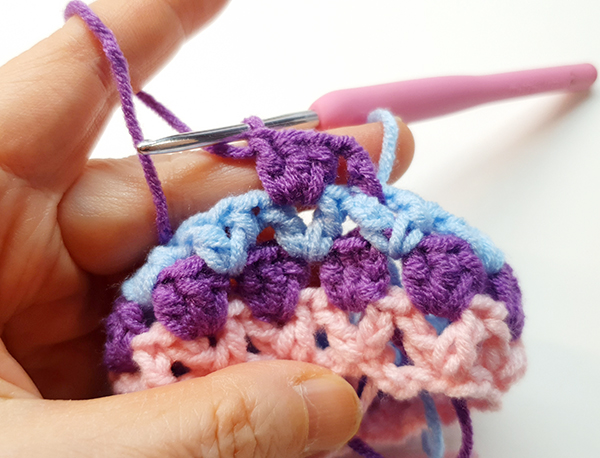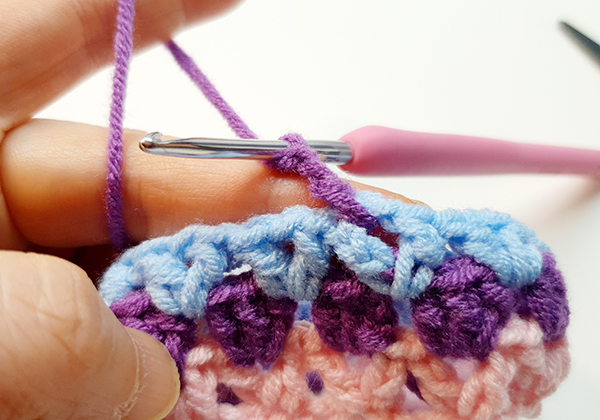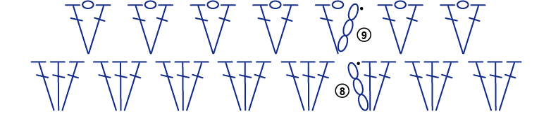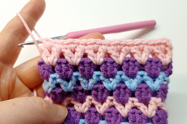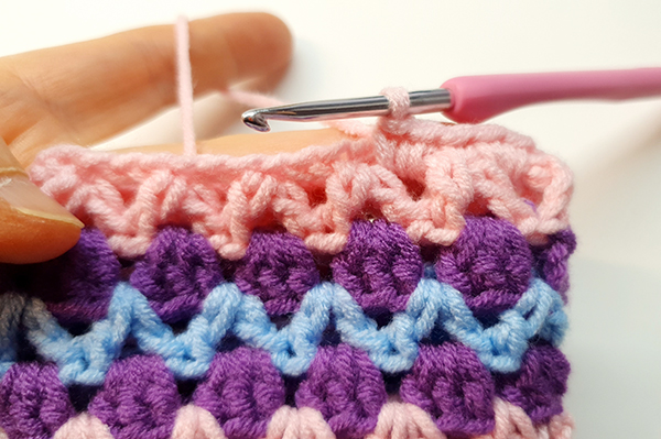 2. 아랫단의 브이자 가운데 고랑마다 한길긴뜨기 3개를 쭉 떠줍니다.