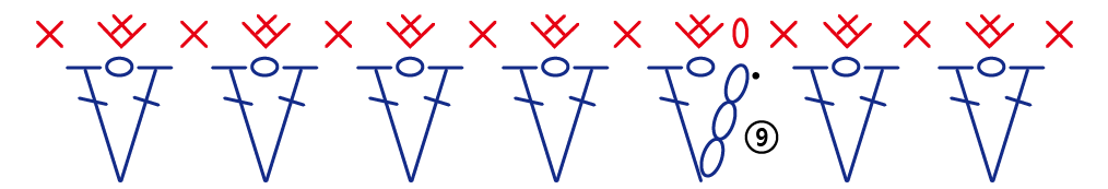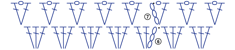 7. 아래쪽 부분도 앞 뒷면 두 장을 같이 붙여서 위 도안처럼 브이자 가운데에는 짧은 뜨기 두개, 브이자와 브이자 사이 고랑에는 짧은뜨기 한 개를 반복해서 떠주어 밑에 부분도 막아줍니다.