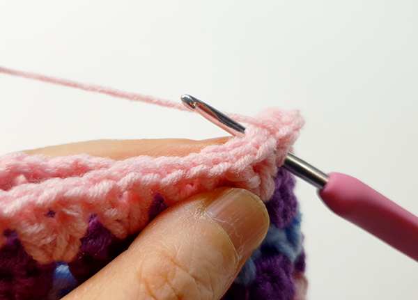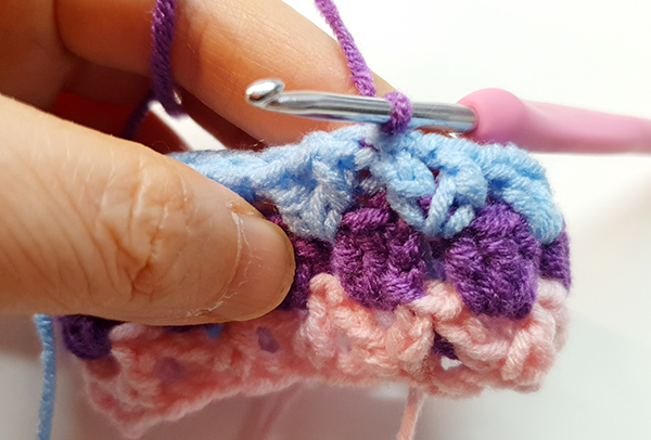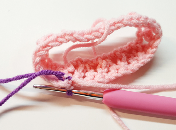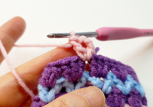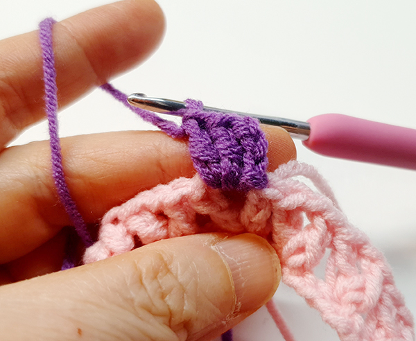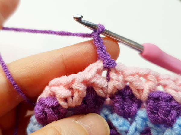 1. 실 칼라를 바꿔서 빼뜨기 한 뒤 오른쪽 고랑에 바늘을 넣어 기둥사슬 3개를 떠줍니다.
