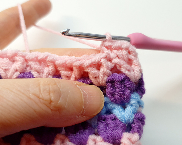 3. 겹친 면의 세트를 서로 잘 마주 보게 잡은 뒤 브이자 고랑에 앞 뒤 면을 같이 잡고 짧은 뜨기 두 개를 떠줍니다.