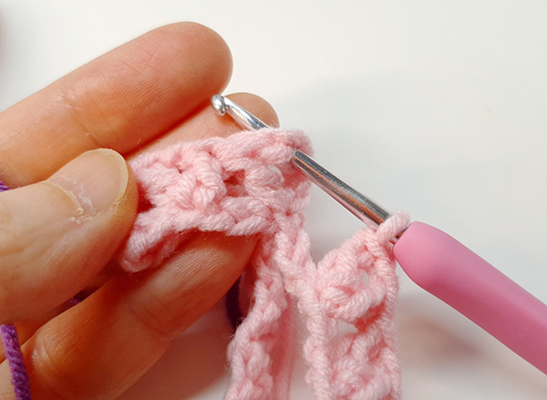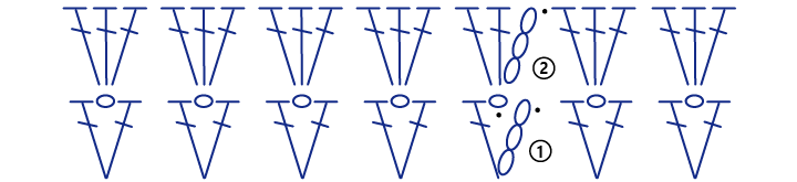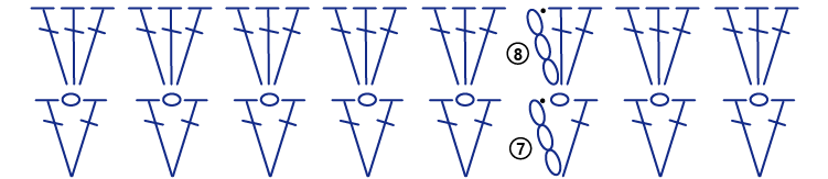 2. 브이자 가운데 사슬 밑의 고랑마다 한길긴뜨기 세 개씩 넣어줍니다.
