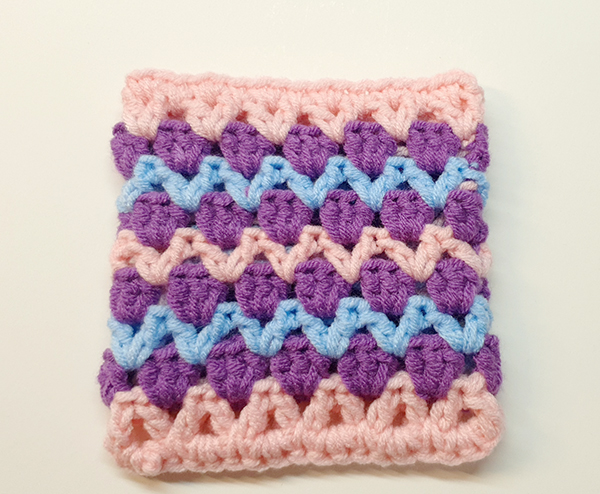 5. 브이자 가운데에는 짧은 뜨기 두개를, 브이자 사이에는 짧은뜨기 한 개를 떠서 수세미를 납작하게 서로 붙여줍니다.