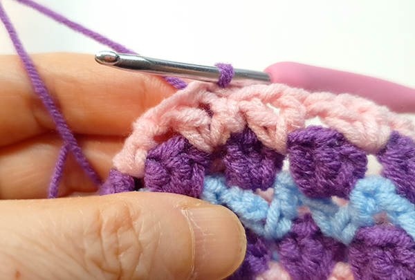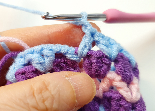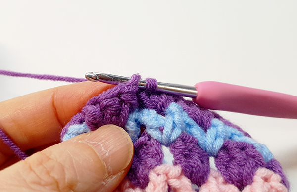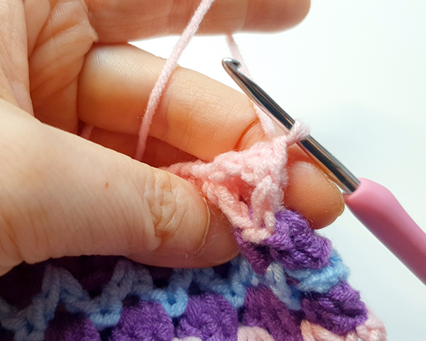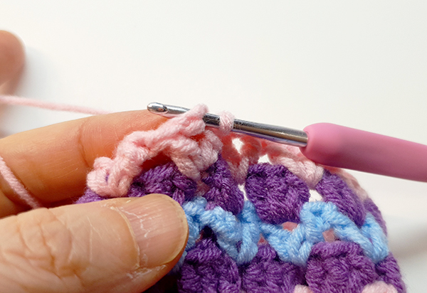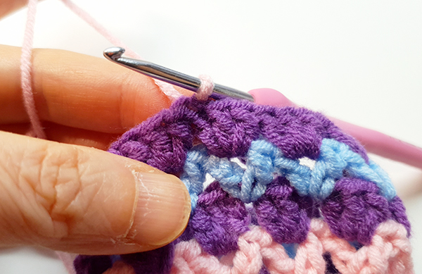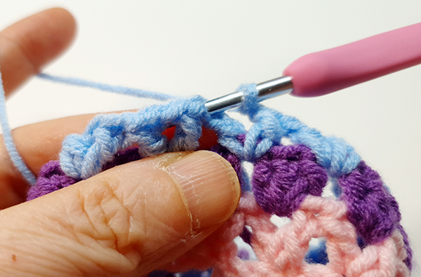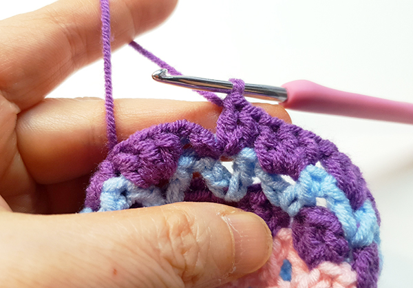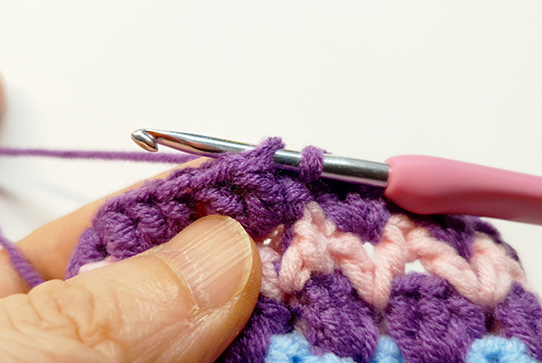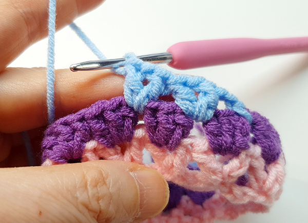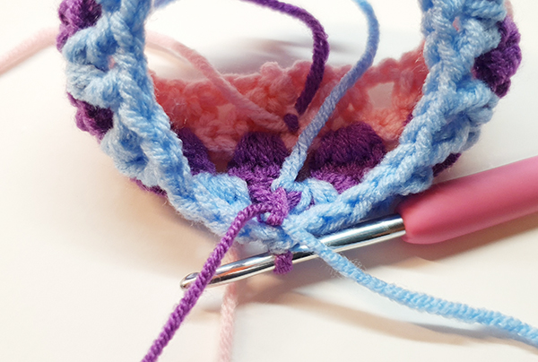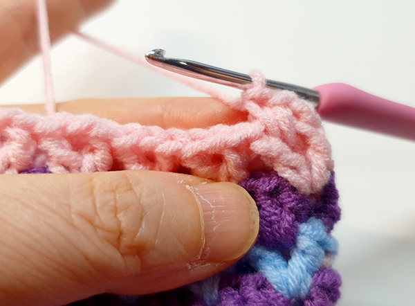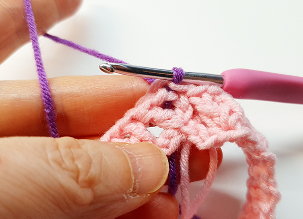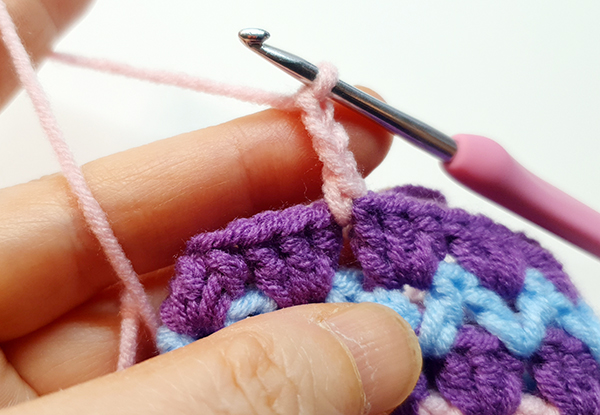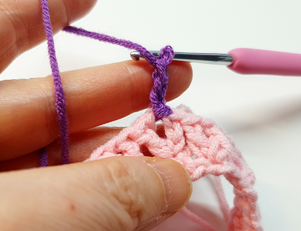 4. 기둥사슬 3번째 코에 빼뜨기 해줍니다. 이때 빼뜨기 할 자리에 바늘을 넣고 다른 칼라의 실을 가져와서 빼뜨기 해줍니다.