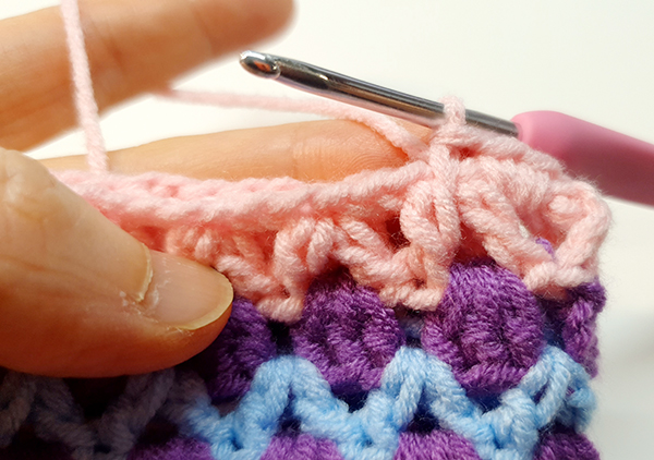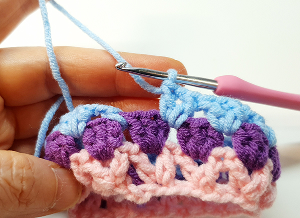 2. 아랫단의 브이자 가운데 고랑마다 한길긴뜨기 3개를 쭉 떠줍니다.