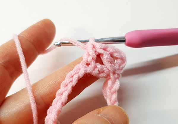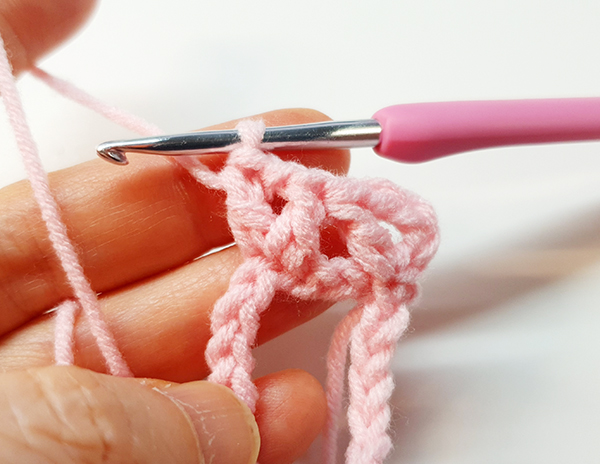 5. 사슬 두 코를 건너고 세 번째 코에 앞서 했던것과 마찬가지로 한길긴뜨기 + 사슬1개 + 한길긴뜨기를 세번째 사슬코에 넣어줍니다.