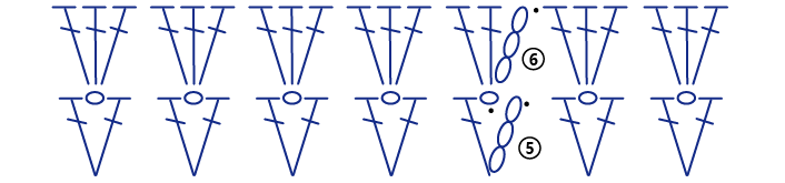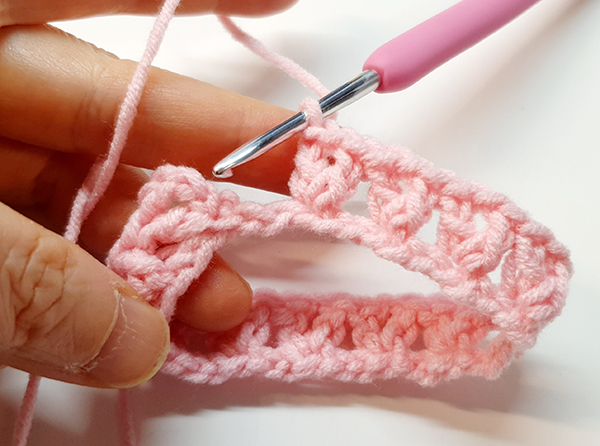2. 브이자 가운데 사슬 밑의 고랑마다 한길긴뜨기 세 개씩 넣어줍니다.