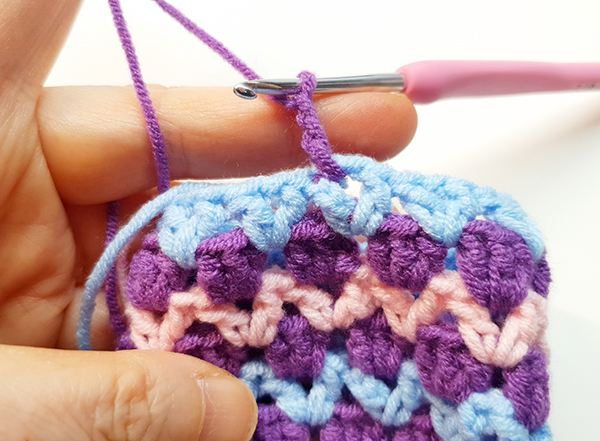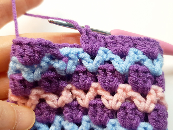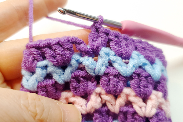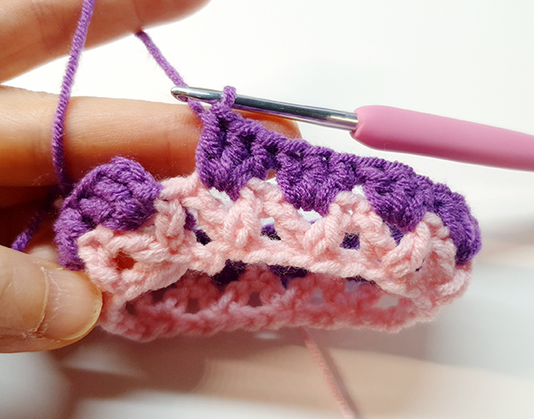 4. 브이자와 브이자 사이의 고랑에도 짧은 뜨기를 한개 앞 뒷면 같이 잡아서 떠줍니다.