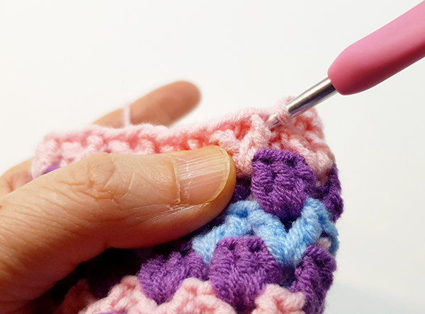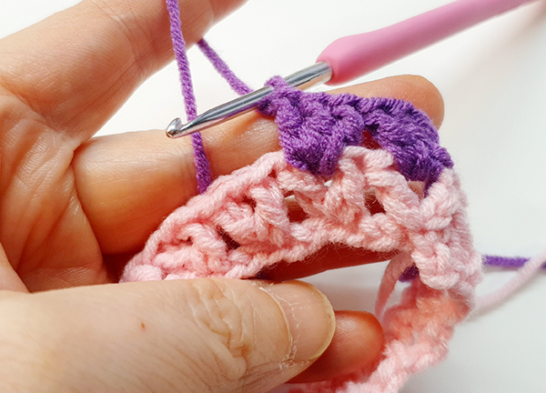 3. 겹친 면의 세트를 서로 잘 마주 보게 잡은 뒤 브이자 고랑에 앞 뒤 면을 같이 잡고 짧은 뜨기 두 개를 떠줍니다.