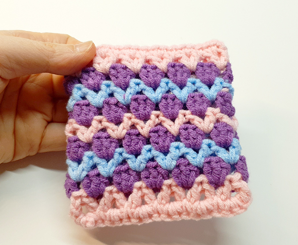 5. 브이자 가운데에는 짧은 뜨기 두개를, 브이자 사이에는 짧은뜨기 한 개를 떠서 수세미를 납작하게 서로 붙여줍니다.