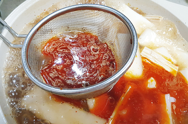 2. 마라탕 만들 팬에 물을 조금 붓고 물을 끓입니다. 마라탕 소스를 넣어주는데요, 가능한 채에 걸러서 넣어 주는 게 좋습니다. 처음에 멋모르고 그냥 넣어서 먹었었는데, 그 자잘한 건더기들 때문에 먹기 불편하고, 보기에도 채에 거르는 게 더 나아요