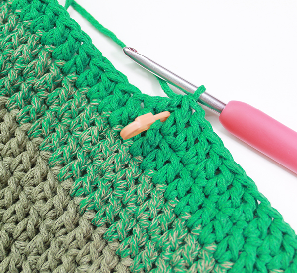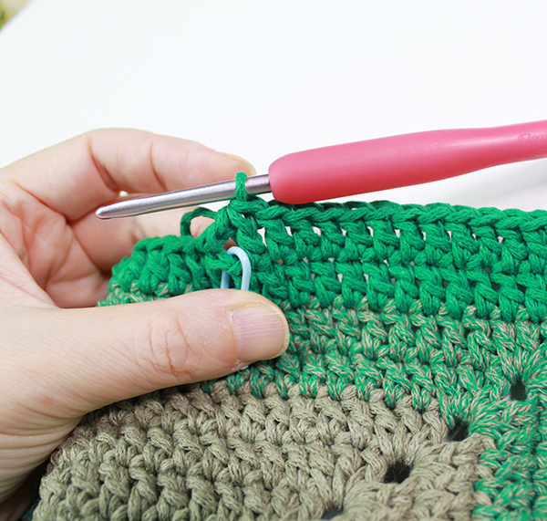 2. 이제 더 이상 옆면은 올리지 않은 것이기에 마무리를 할 건데요, 사슬하나 짧은 뜨기로 붙여주는 것이 아니라