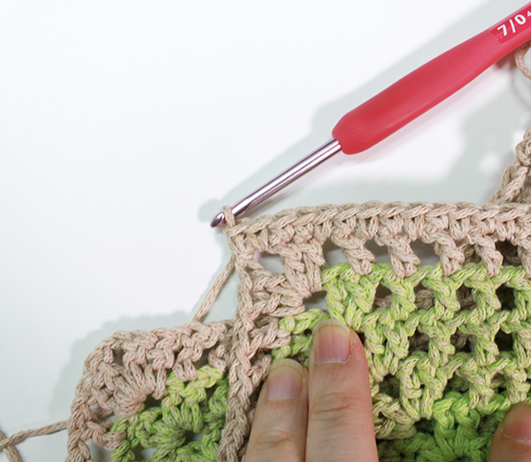 4. 모서리 사슬 부분은 한길긴뜨기 2 + 사슬 2 + 한길긴뜨기 3개를 떠줍니다.