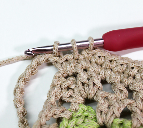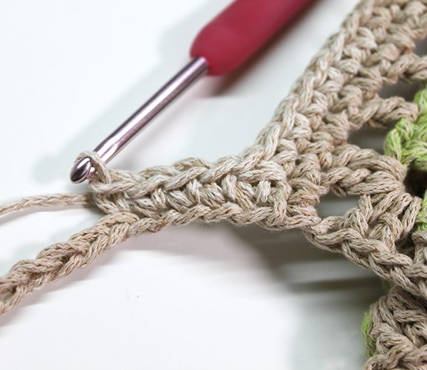 2. 1단에 떴던 짧은 뜨기를 감싸서 모서리 고랑에 한길긴뜨기를 두 개 떠줍니다.