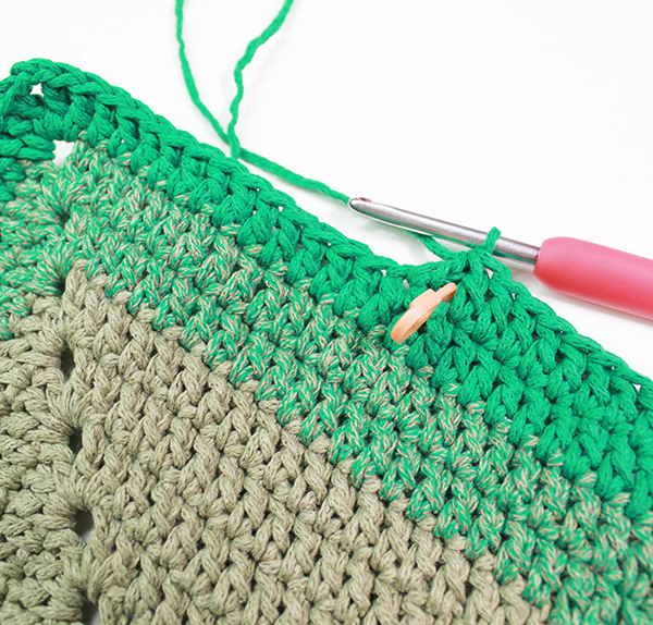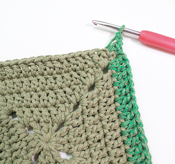 1단의 한길긴뜨기 코마다 한길긴뜨기를 떠주고 모서리는 사슬코 고랑에 한길긴뜨기 2개 + 사슬 2개 + 한길긴뜨기 3개(마지막 한길긴뜨기는 모서리 고랑의 코가 아니라 첫 번째 한길긴뜨기 코를 대신 고랑에 뜬 것임)