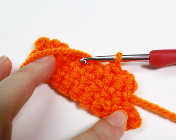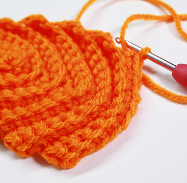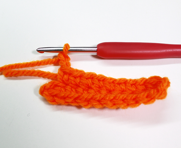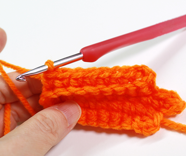 9. 2단 : 한코에 이랑뜨기로 짧은뜨기 세 개 떠준 뒤 다시 한코에 하나씩 짧은뜨기를 8개 뜨면서 되돌아옵니다.
