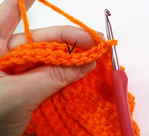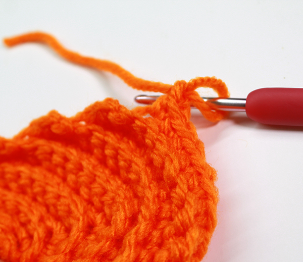 4. 1단 : 10번째 짧은뜨기 뜬 곳에 짧은뜨기 두 개를 더 뜹니다. (매듭 바로 앞 첫 번째 사슬코 하나에 짧은뜨기 3개)