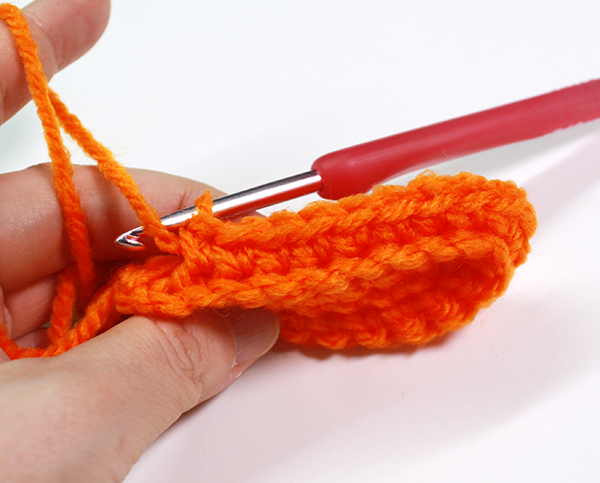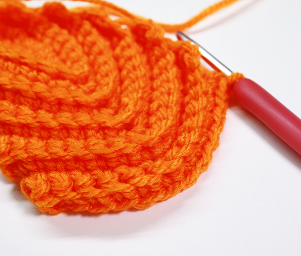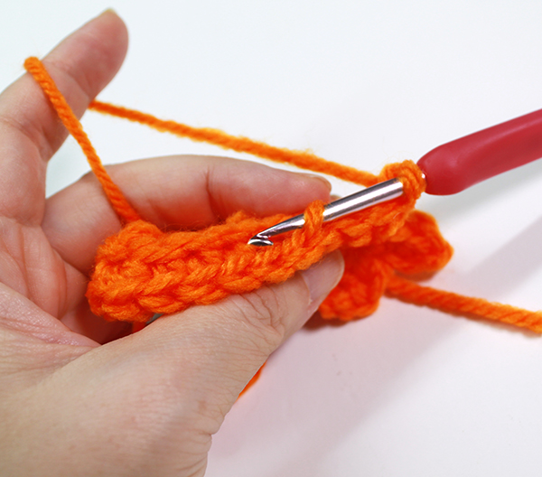 9. 2단 : 한코에 이랑뜨기로 짧은뜨기 세 개 떠준 뒤 다시 한코에 하나씩 짧은뜨기를 8개 뜨면서 되돌아옵니다.