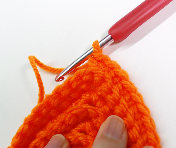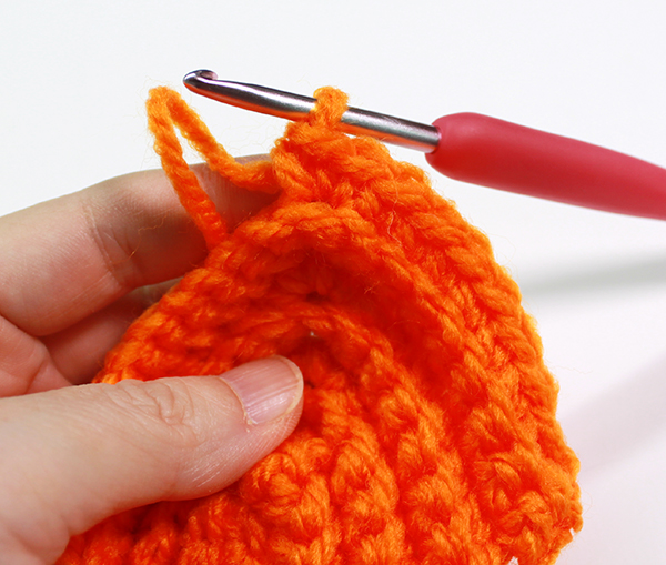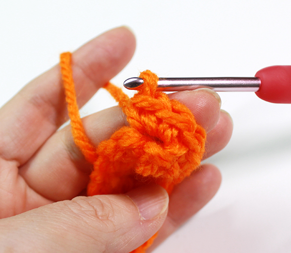 4. 1단 : 10번째 짧은뜨기 뜬 곳에 짧은뜨기 두 개를 더 뜹니다. (매듭 바로 앞 첫 번째 사슬코 하나에 짧은뜨기 3개)