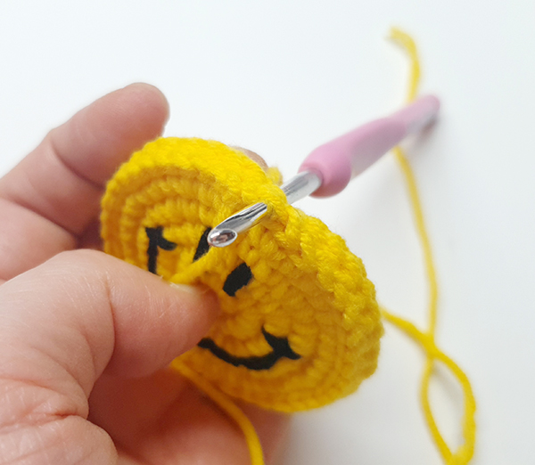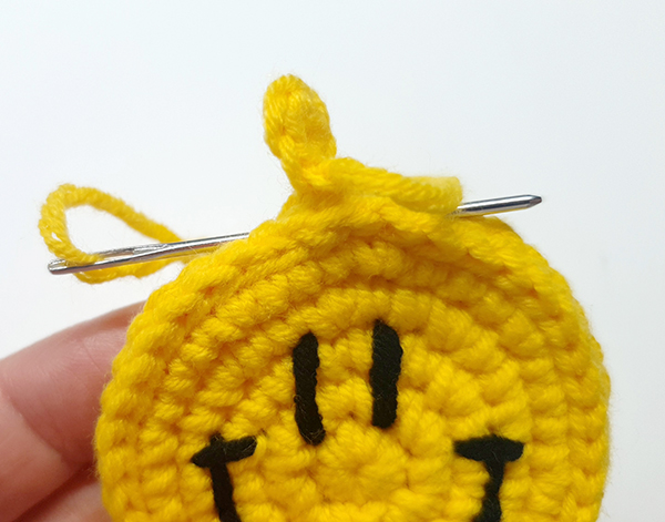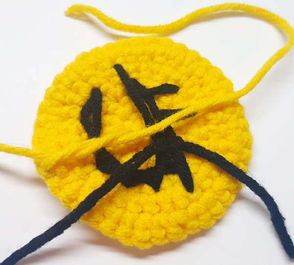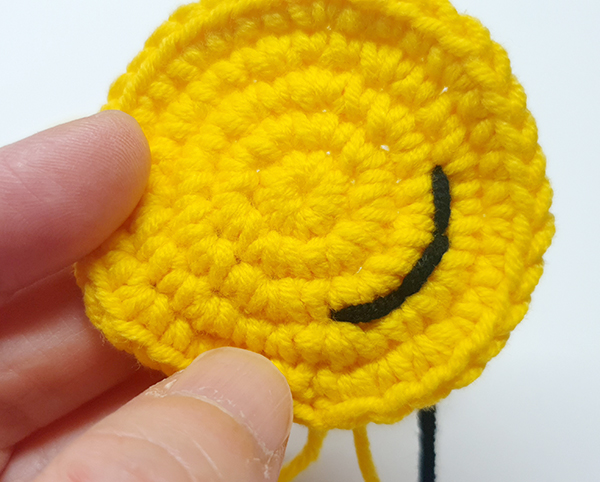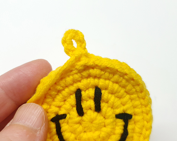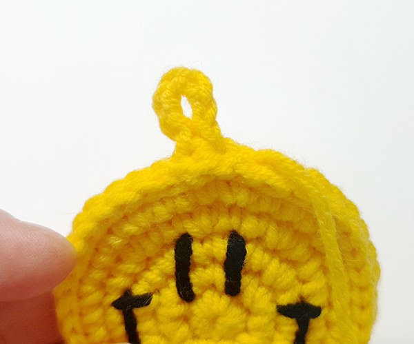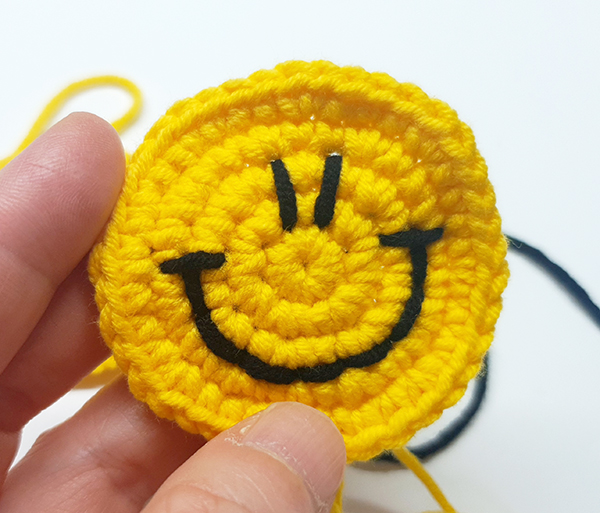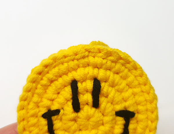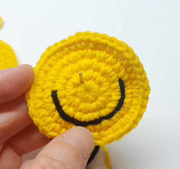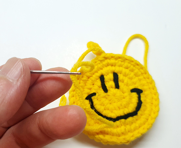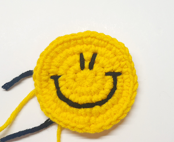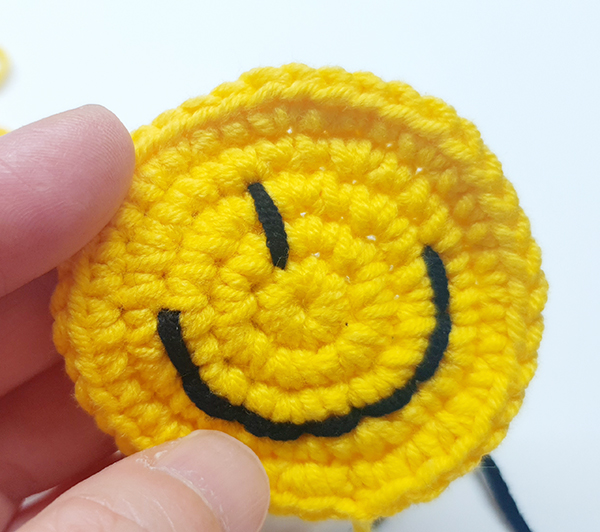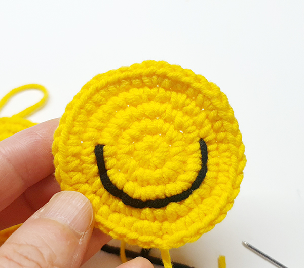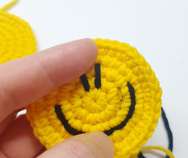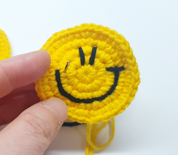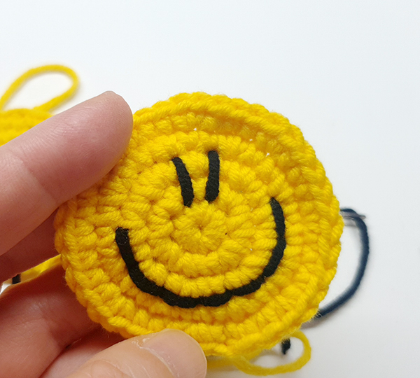 스마일얼굴 원형을 두개 만들어서 모두 스마일 스티치를 해주고 두 개를 붙여서 만드는 키링이에요.