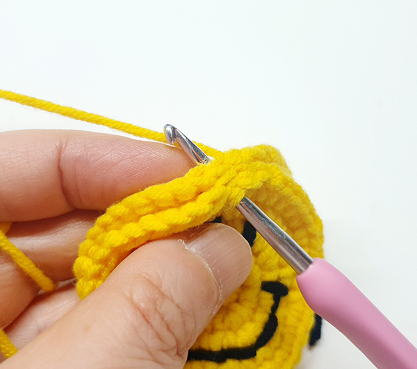 2. 각코마다 한코에 짧은뜨기 두 개씩 해준 뒤 첫 번째 짧은뜨기 코에 빼뜨기 해줍니다.