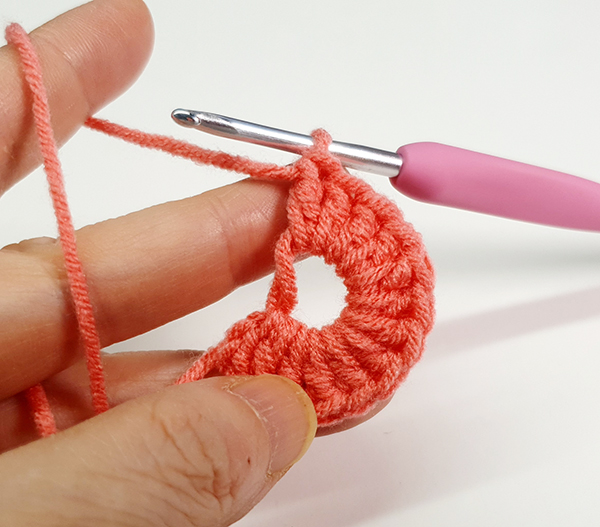 2. 단수링을 빼고 그 자리에 바늘을 넣어 바로 기둥사슬 2개 떠줍니다.
