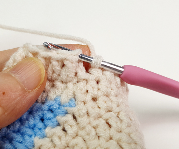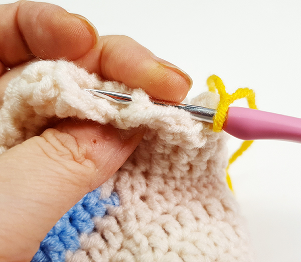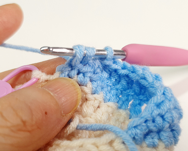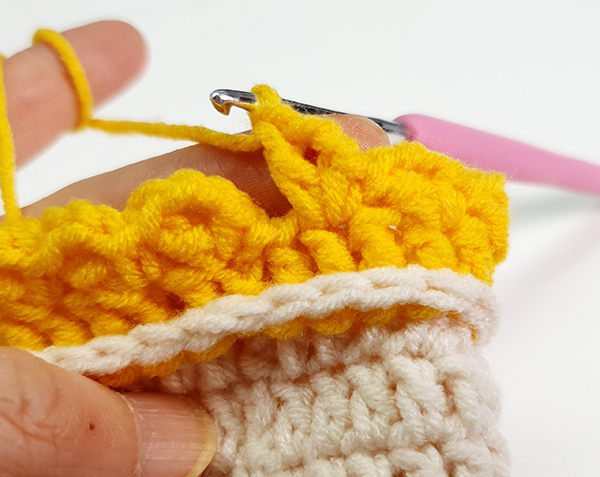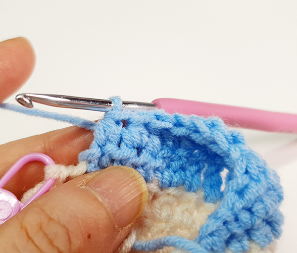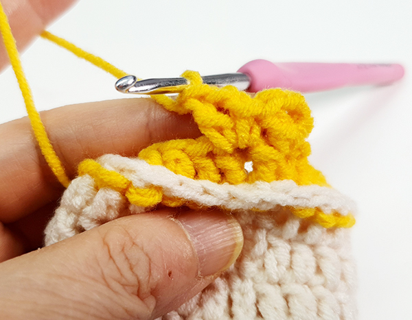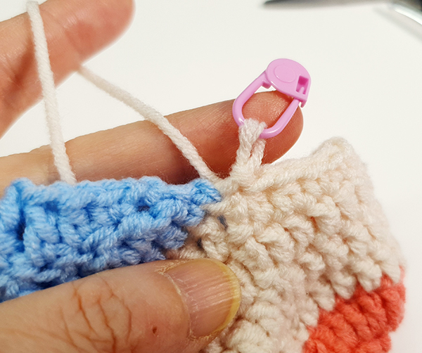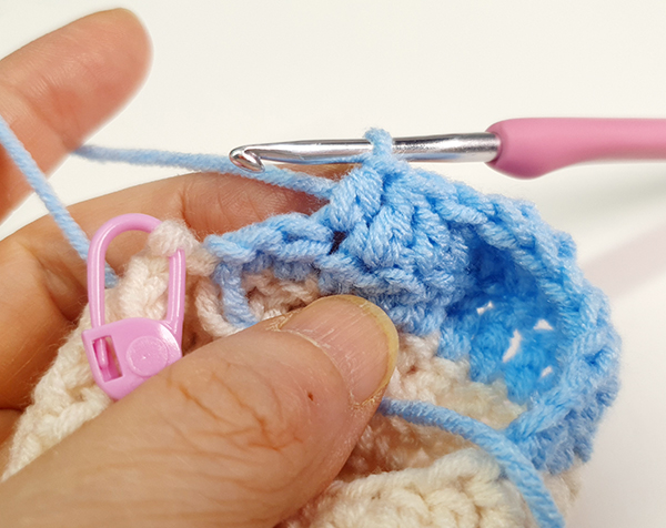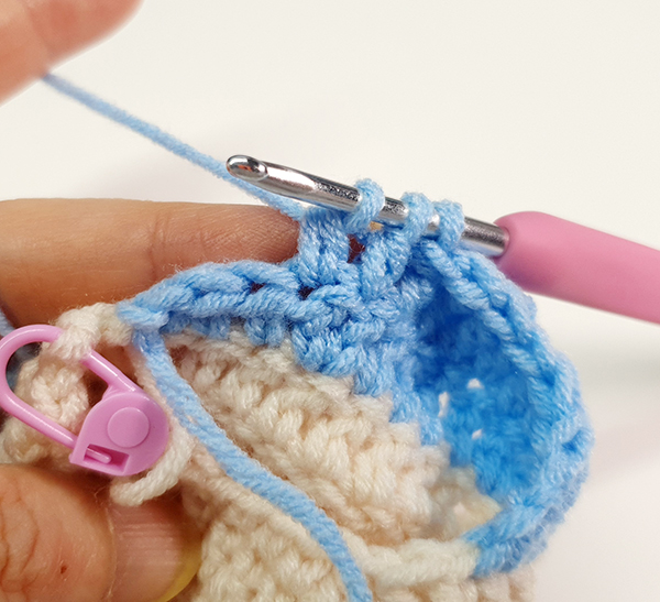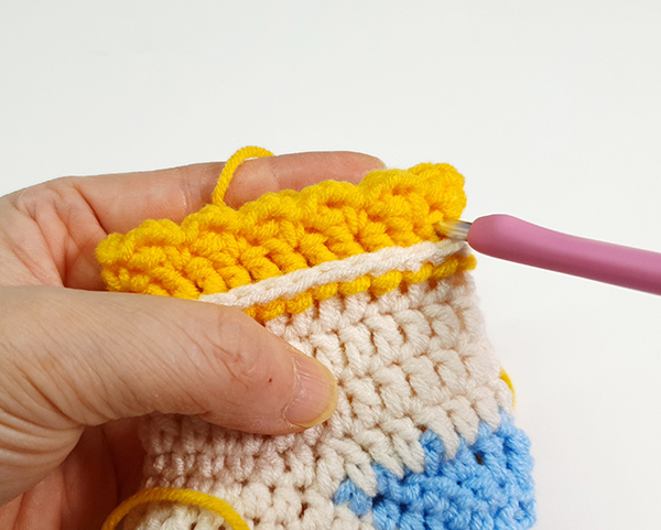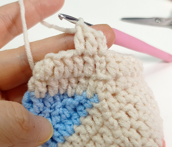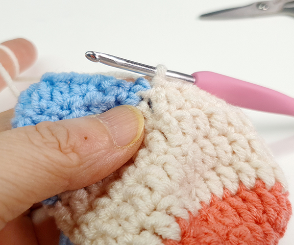 7. 개인적으로 저는 수세미를 안에 실에 보이지 않게 다 막는 편이라 무늬 아래 단에서 스티치 해주어 입구를 막아주었습니다.