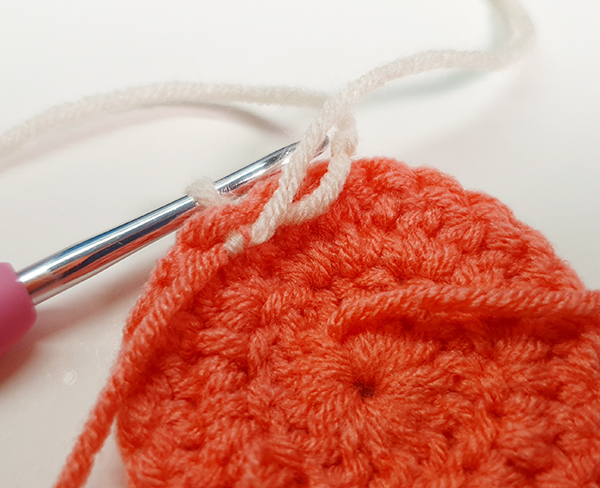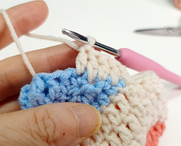 5. 3단에서 칼라를 바꾸어 주기 위하여 미리 칼라 교체를 해줄건데요, 마지막 한길긴뜨기를 뜰때에 아래와 같이 실을 교체해 주어 한길긴뜨기를 완성한 뒤 기둥사슬 3번째 코에 빼뜨기 해줍니다.