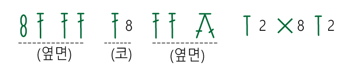 1. 위 도안대로 떠주면 되는데요, 한길긴뜨기14개, 긴뜨기2개, 짧은뜨기8개, 긴뜨기 2개를 차례대로 떠줍니다.