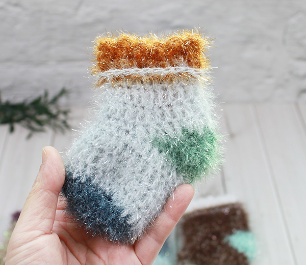 크리스마스 시즌에는 빨간색, 녹색으로 만들어 아기싼타양말 수세미로 선물해도 좋을것 같아요.