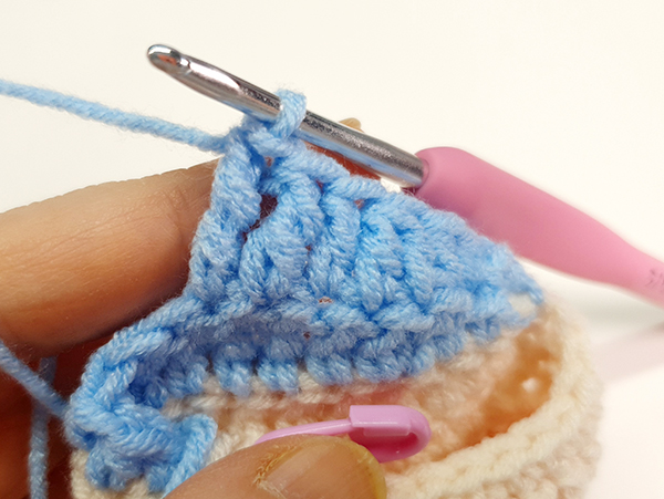 12. 이제 뒤꿈치 2단을 떠줄 차례인데요, 짧은뜨기 모아뜨기를 한 뒤 사슬 하나를 떠주고 편물을 뒤집어줍니다.