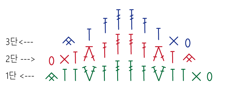 3. 다시 기둥사슬 3개 올리고 같은 방식으로 두 단을 더 떠줍니다. ( 한코에 한개씩 총 26코 총 3단)