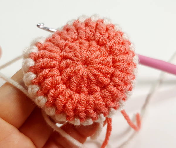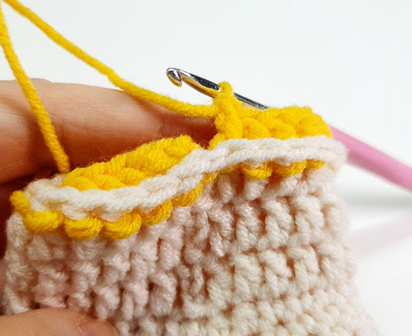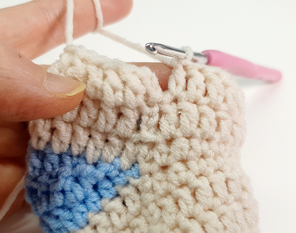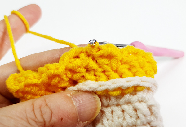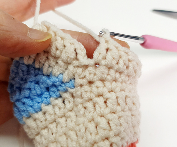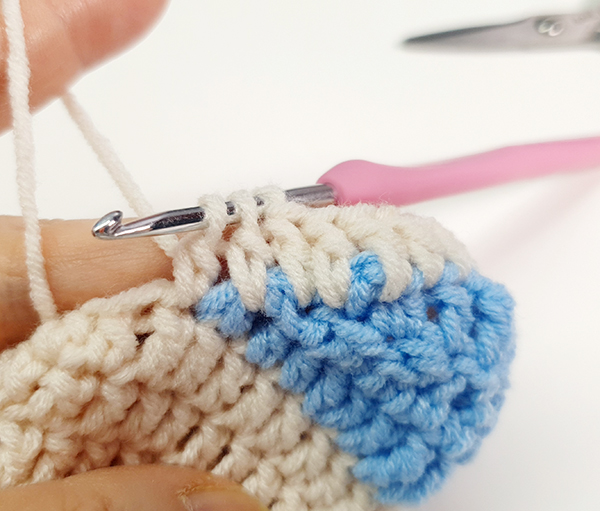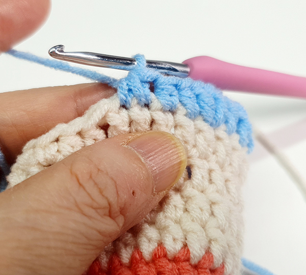 7. 개인적으로 저는 수세미를 안에 실에 보이지 않게 다 막는 편이라 무늬 아래 단에서 스티치 해주어 입구를 막아주었습니다.
