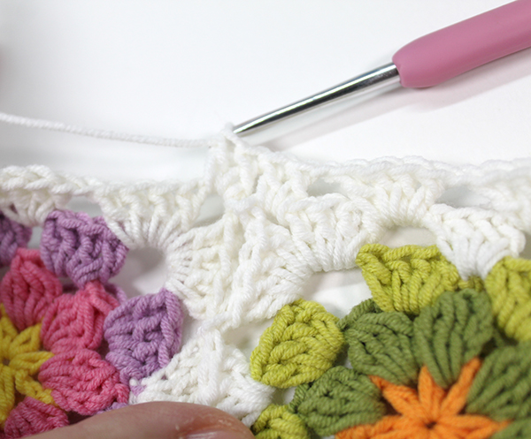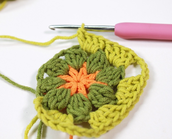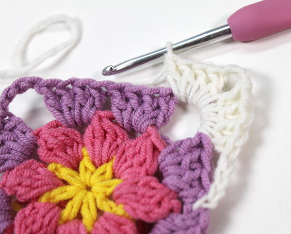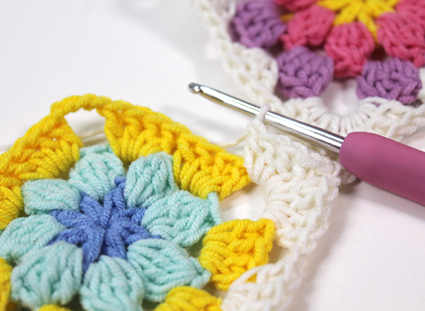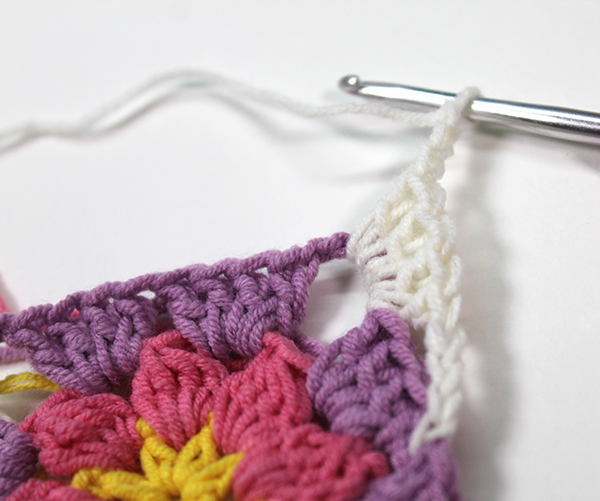 2. 모서리 사슬 3개 중 두 번째 사슬을 뜰 때에 다른 모티브를 가져와 고랑에 사슬을 뜨면서 붙여줍니다.