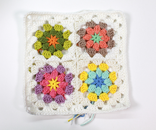 사진은 일단 모티브 네개를 떠서 붙인 작품인데요, 모티브의 갯수를 늘리면 블랭킷도 만드실 수 있고, 쿠션 커버나 기타 상상할 수 있는 모든 것들을 자유롭게 만들어 볼 수 있습니다.